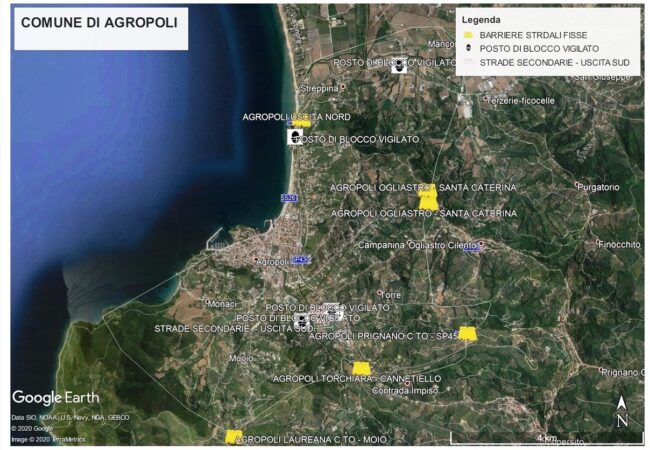 Il Comune di Agropoli presenta circa 17 punti di accesso alla città, molti dei quali secondari. Tale stato di cose rende complicato, se non impossibile, un controllo attento degli ingressi. Da qui la decisione del sindaco Adamo Coppola, che ha fatto proprie le decisioni del C.O.C. (Centro Operativo Comunale), formalizzandole in un’apposita ordinanza (n. 8352 del 24.03.2020), consistenti nella chiusura di alcuni percorsi secondari di accesso al territorio, tramite apposizione di barriere, transenne e new jersey in cemento, adeguatamente segnalati.
