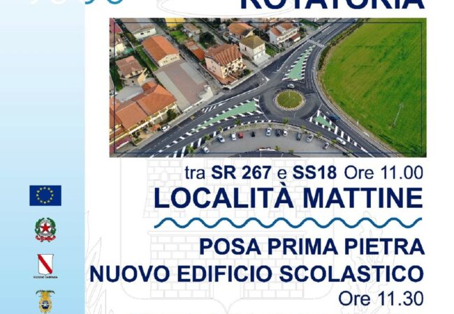 Si tratta di due interventi, il primo concluso; il secondo da iniziare. L’appuntamento è alle ore 11.00 per l’inaugurazione della rotatoria; ci si sposterà poi, alle ore 11.30, presso il piazzale antistante la scuola primaria Mattine, per la posa della prima pietra del nuovo edificio scolastico, che nascerà nelle immediate adiacenze del plesso che fa parte dell’I.C. “Agropoli-San Marco”.