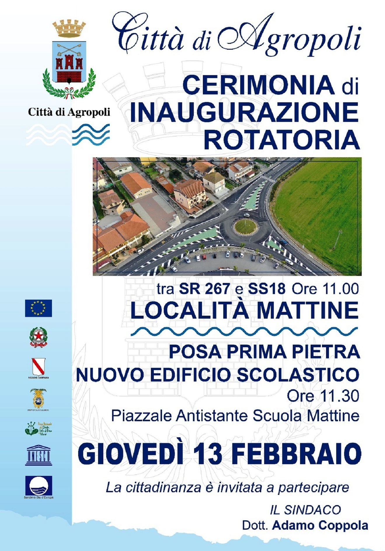 E’ in programma domani, giovedì 13 febbraio, l’inaugurazione della rotatoria tra la SR 267 e la SS 18 e la posa della prima pietra del nuovo edificio scolastico, entrambi in località Mattine, ad Agropoli.