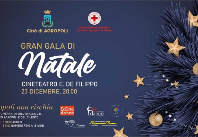 E’ in programma venerdì 23 dicembre alle ore 20.00, presso il Cineteatro “De Filippo” di Agropoli il “Gran Galà di Natale”, una iniziativa di solidarietà per coloro che hanno subito danni per l’alluvione che ha colpito la città di Agropoli lo scorso 19 novembre.