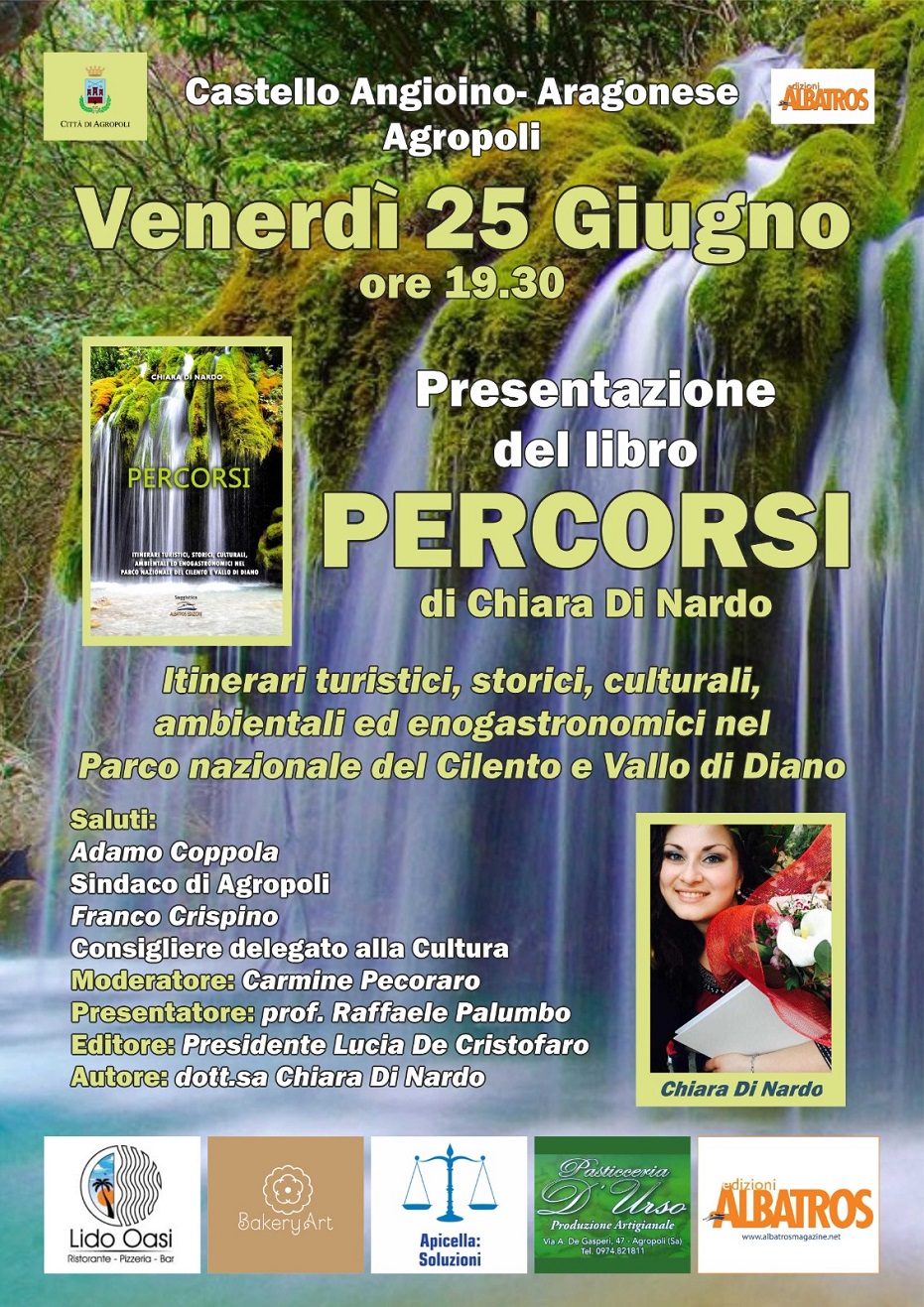 E’ in programma venerdì 25 giugno alle ore 19.30, la presentazione del libro “Percorsi” – Itinerari turistici, storici, culturali, ambientali ed enogastronomici nel Parco Nazionale del Cilento, Vallo di Diano ed Alburni, di Chiara Di Nardo. Nell’affascinante location del Castello Angioino Aragonese, la giovane autrice agropolese presenterà il testo, edito da Albatros. E’ la sua tesi di laurea in Beni Enogastronomici, ma in versione ampliata.