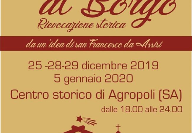 Sono previste quattro rappresentazioni, nei giorni 25, 28, 29 dicembre e 5 gennaio. Una passeggiata storica nel suggestivo borgo cittadino ambientata nel 1200, al tempo di San Francesco. A memoria del passaggio del poverello di Assisi nella comunità cilentana, il presepe sarà un percorso figurato, con qualche scena narrata, per rivivere l’atmosfera di allora, lungo i caratteristici vicoli del centro storico. Il percorso sarà articolato in diverse sezioni con punto di accoglienza in via Emanuele Di Sergio.