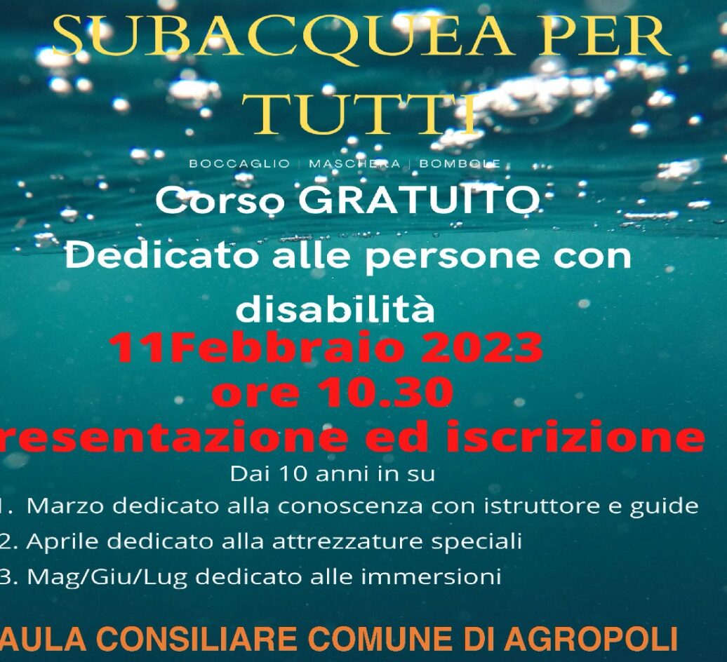 E’ pronto a partire, per il terzo anno consecutivo, il progetto “Subacquea per tutti”, tenuto dall’ASD Diving Yoghi, in convenzione con il Comune di Agropoli. Si propone di coniugare, gratuitamente, disabilità e subacquea, un connubio che negli anni passati si è rivelato efficace e che ha reso felici i tanti ragazzi che hanno partecipato e le loro famiglie. Alla validità del progetto ha creduto l’Amministrazione comunale guidata dal sindaco Roberto Mutalipassi e in primis il vicesindaco nonché assessore alle Politiche Sociali, Maria Giovanna D’Arienzo, che ne è diventata la prima promotrice.