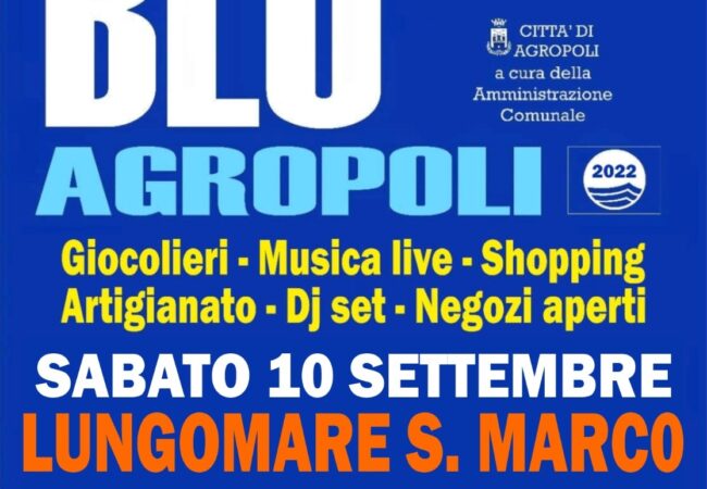 Il programma prevede musica live, spettacoli, dj set, animazione con artisti di strada, shopping. La manifestazione, che ritorna sul lungomare dopo due anni di stop causa pandemia, ricorre quest’anno per festeggiare il riconoscimento, per la città di Agropoli, della 23esima Bandiera blu per le spiagge e il decimo consecutivo nella categoria approdi turistici.