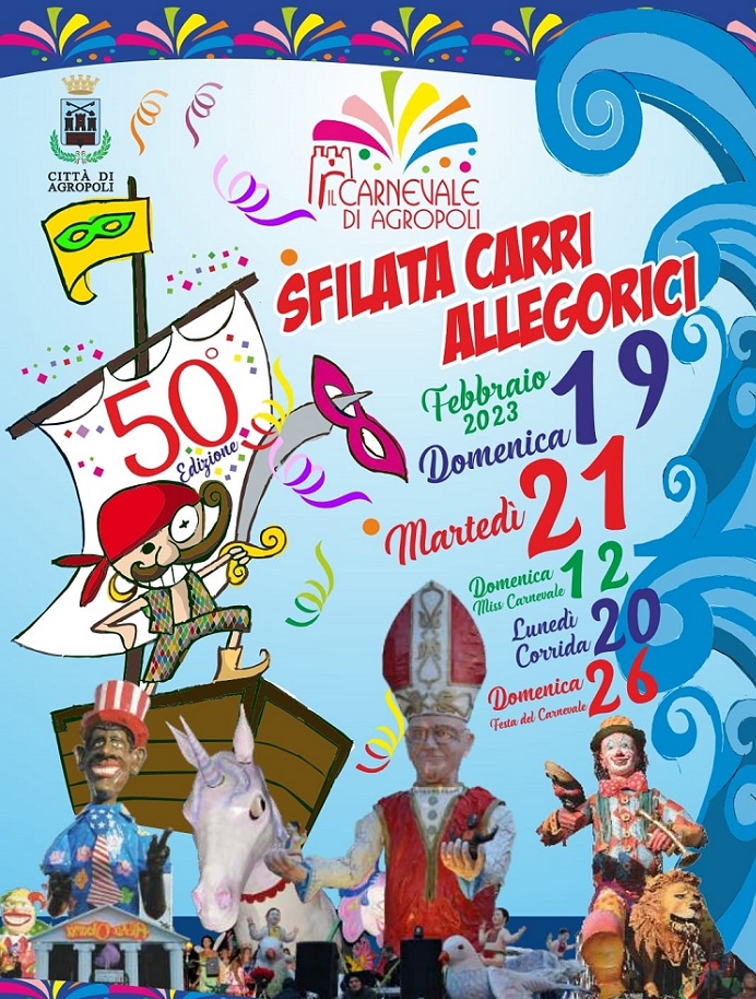 Si rinnova, dopo due anni di stop causa pandemia, l’appuntamento con il Carnevale di Agropoli. Un anno importante il 2023 in quanto la manifestazione, che piace a bambini e adulti, compie mezzo secolo. Gli eventi clou sono rappresentati dalle sfilate dei carri allegorici domenica 19 febbraio e martedì 21 febbraio.