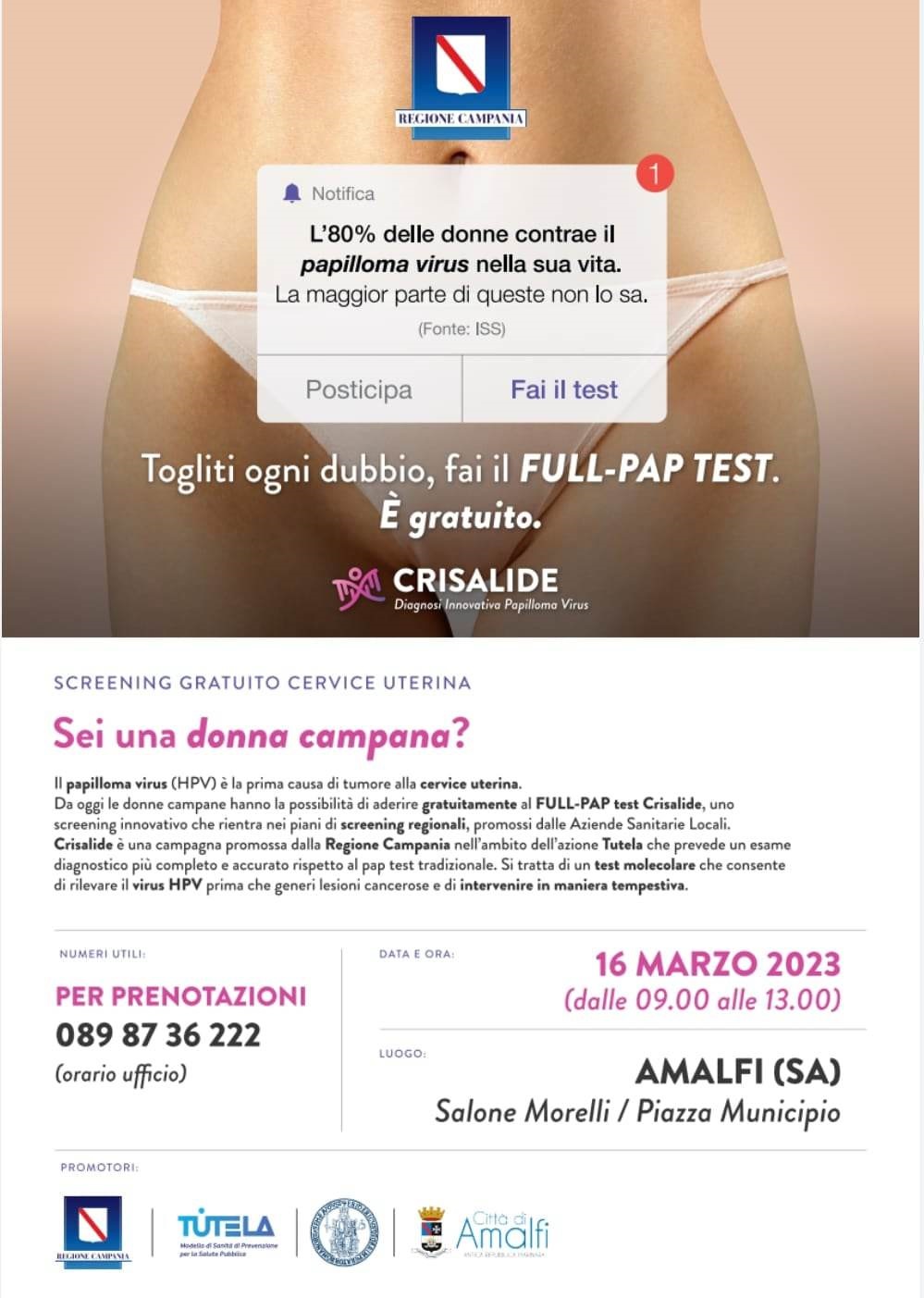 L’Amministrazione Comunale di Amalfi, guidata dal sindaco Daniele Milano, aderisce alla campagna di sensibilizzazione del FULL-PAP TEST Crisalide per la diagnosi innovativa del papilloma virus (HPV), promuovendo una giornata di screening gratuiti della cervice uterina, in programma il prossimo giovedì 16 marzo 2023 al Salone Morelli di Palazzo di Città, dalle ore 9 alle 13.