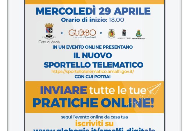 La presentazione dell’innovativo servizio avverrà mercoledì 29 aprile 2020 alle ore 18:00 con uno speciale evento online a cui i cittadini potranno partecipare comodamente da casa, collegandosi all’indirizzo www.globogis.it/amalfi-digitale ed interagendo con i relatori a cui sarà possibile fare domande. Tra i partecipanti all’evento online saranno anche sorteggiati alcuni vincitori di simpatici gadget digitali messi in palio da Globo srl, software house produttrice dello Sportello Telematico.