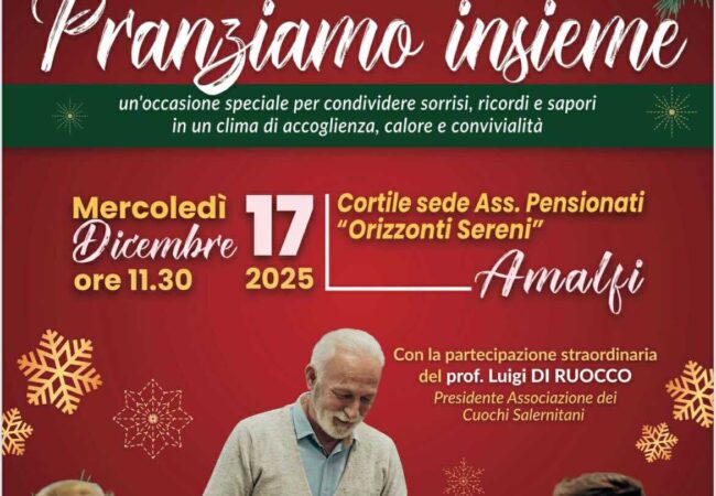 Al Pranzo di Natale, organizzato in collaborazione con l’Associazione Pensionati “Orizzonti Sereni” e aperto a tutti gli anziani della Città, è attesa anche la presenza dell’arcivescovo di Amalfi – Cava de’Tirreni, Monsignor Orazio Soricelli, mentre le zampogne con le loro nenie natalizie faranno la loro apparizione durante il momento conviviale.