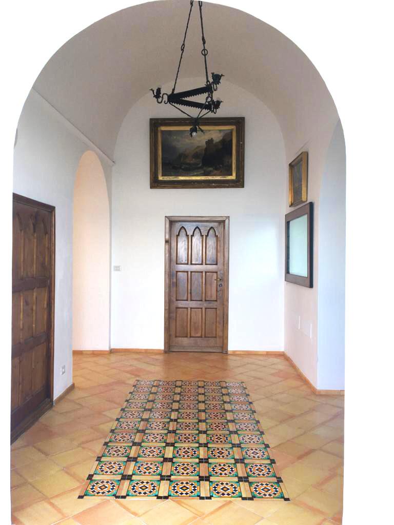 Il cotto della Fornace, viene ancora prodotto con asciugatura naturale e cotto in forno alimentato da fascine in legno. L’asimmetria geometrica del chiostro è stata vinta con un classico e elementare montaggio a cardamone. La pavimentazione esterna è stata oggetto di attenta scelta della granulometria degli inerti per avere il colore dell’antico massetto a sabbia lavata lapillo e cemento.