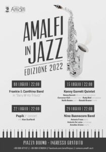 Sarà proprio la rassegna Amalfi in Jazz ad aprire la stagione degli eventi, venerdì 8 Luglio (h. 22 in Piazza Duomo). Protagonista Frankie & Canthina Band in “Barry White Tribute”. Band storica capitanata da Frankie Lo Vecchio, che propone un repertorio internazionale Soul/Funky/Dance/ 70/80, tra ritmi trascinanti e con un’orchestra di 15 elementi, per rendere omaggio al Re della black music.