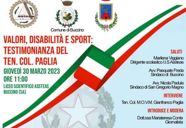 Annuncia così, il sindaco del Comune di Buccino, l’avvocato Pasquale Freda, l’incontro organizzato dalla comunità scolastica liceale che si svolgerà giovedì 30 marzo alle ore 11 presso il Liceo Scientifico “Assteas” di Buccino, dal titolo “Valori, Disabilità e Sport” e che vedrà come ospite d’onore, il Tenente Colonnello dell’Esercito Italiano, Gianfranco Paglia.
