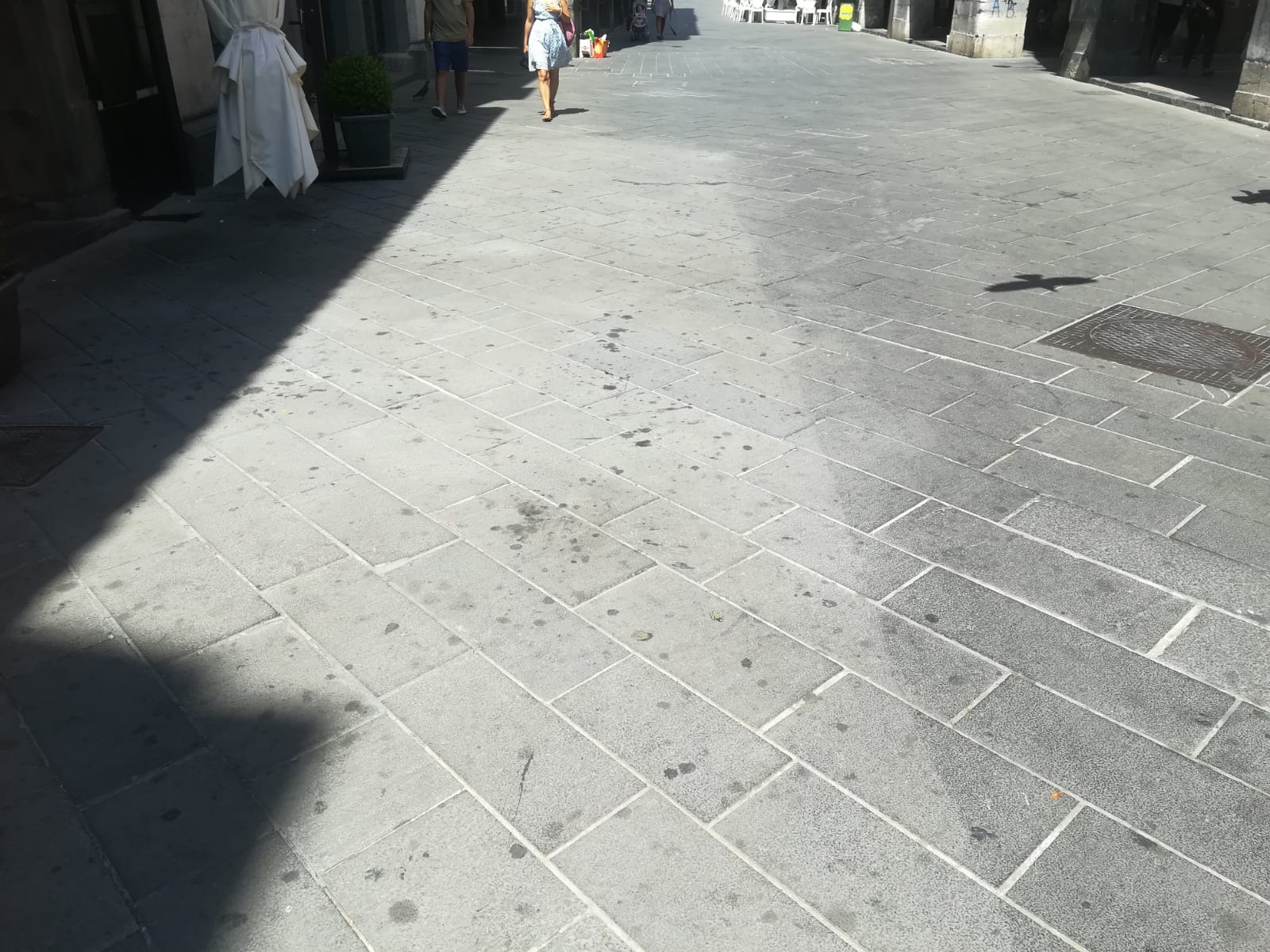 Per porre rimedio, come si evince dalle foto, e pulire il selciato sono state utilizzate sostanze speciali che, nell’intento di pulire (involontariamente, s’intende), hanno vistosamente sbiancato una porzione del pavimento del corso. Brutto a vedersi, e certamente non da tollerarsi.