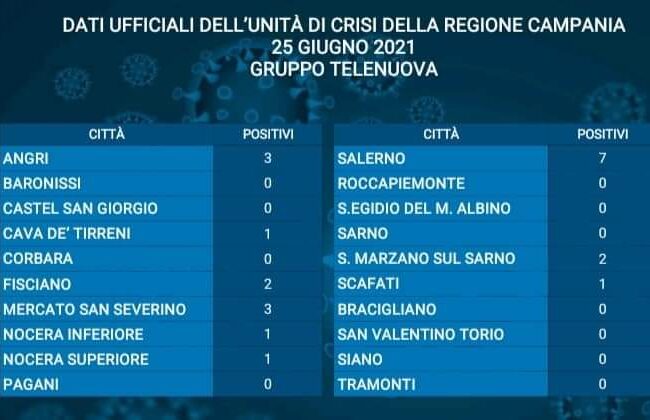 E’ quanto si rileva dal report ufficiale comunicato dall’Unità di crisi della Regione Campania, pubblicato in un post sulla propria pagina Facebook dalla emittente televisiva Telenuova di Pagani.