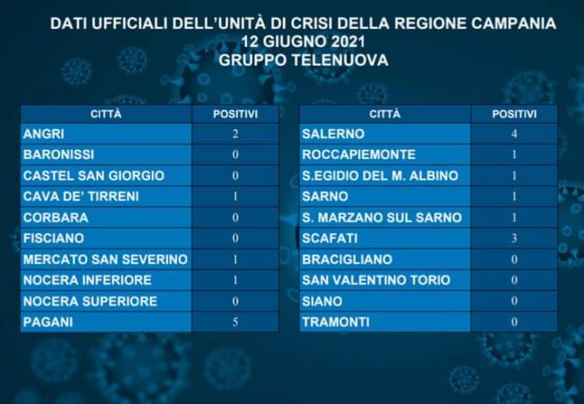 E’ quanto si rileva dal report ufficiale comunicato dall’Unità di crisi della Regione Campania, pubblicato in un post sulla propria pagina Facebook dalla emittente televisiva Telenuova di Pagani.