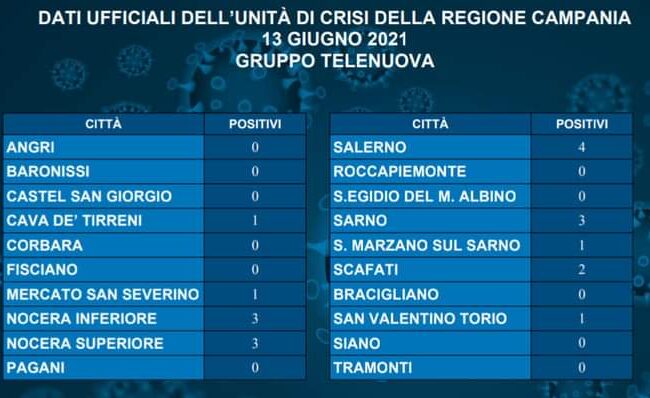 E’ quanto si rileva dal report ufficiale comunicato dall’Unità di crisi della Regione Campania, pubblicato in un post sulla propria pagina Facebook dalla emittente televisiva Telenuova di Pagani.
