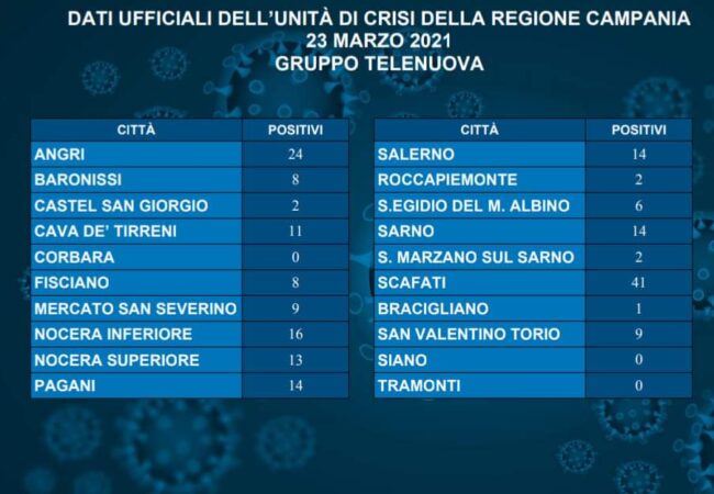 Come si può leggere nella tabella dei dati ufficiali, mentre solo a Corbara, Tramonti e Siano non si sono registrati nella giornata di ieri nuovi casi, il picco maggiore nei comuni viciniori dopo la nostra città si è avuto a Scafati con 41 nuovi casi, seguito da Angri con 24 nuovi casi, poi da Nocera Inferiore con 16 nuovi casi, quindi Salerno, Sarno e Pagani con 14 nuovi casi.