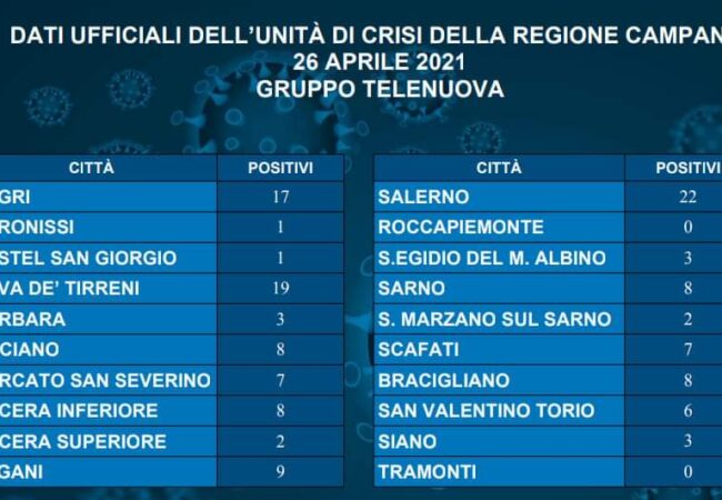 Come si può leggere nella tabella dei dati ufficiali, mentre solo a Roccapiemonte e Tramonti non ci sono stati nuovi contagiati, il picco maggiore nei comuni viciniori si è avuto a Salerno con 22 nuovi casi, seguito dopo la nostra città da Angri con 17 nuovi casi.