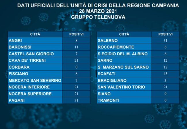 E’ quanto si rileva dal report ufficiale comunicato dall’Unità di crisi della Regione Campania, pubblicato in un post sulla propria pagina Facebook dalla emittente televisiva Telenuova di Pagani.