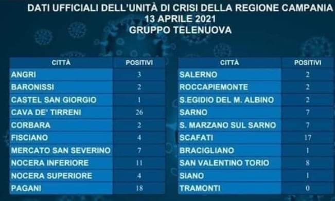 Come si può leggere nella tabella dei dati ufficiali, mentre solo a Tramonti non si sono registrati nella giornata di ieri nuovi casi, dopo la nostra città il picco maggiore nei comuni viciniori si è avuto a Pagani con 18 nuovi casi, quindi a Scafati con 17 nuovi casi.