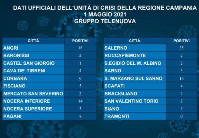 E’ quanto si rileva dal report ufficiale comunicato dall’Unità di crisi della Regione Campania, pubblicato in un post sulla propria pagina Facebook dalla emittente televisiva Telenuova di Pagani.