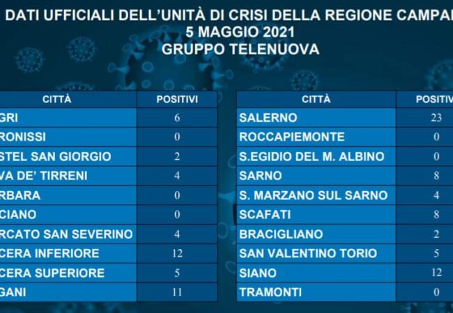 E’ quanto si rileva dal report ufficiale comunicato dall’Unità di crisi della Regione Campania, pubblicato in un post sulla propria pagina Facebook dalla emittente televisiva Telenuova di Pagani.