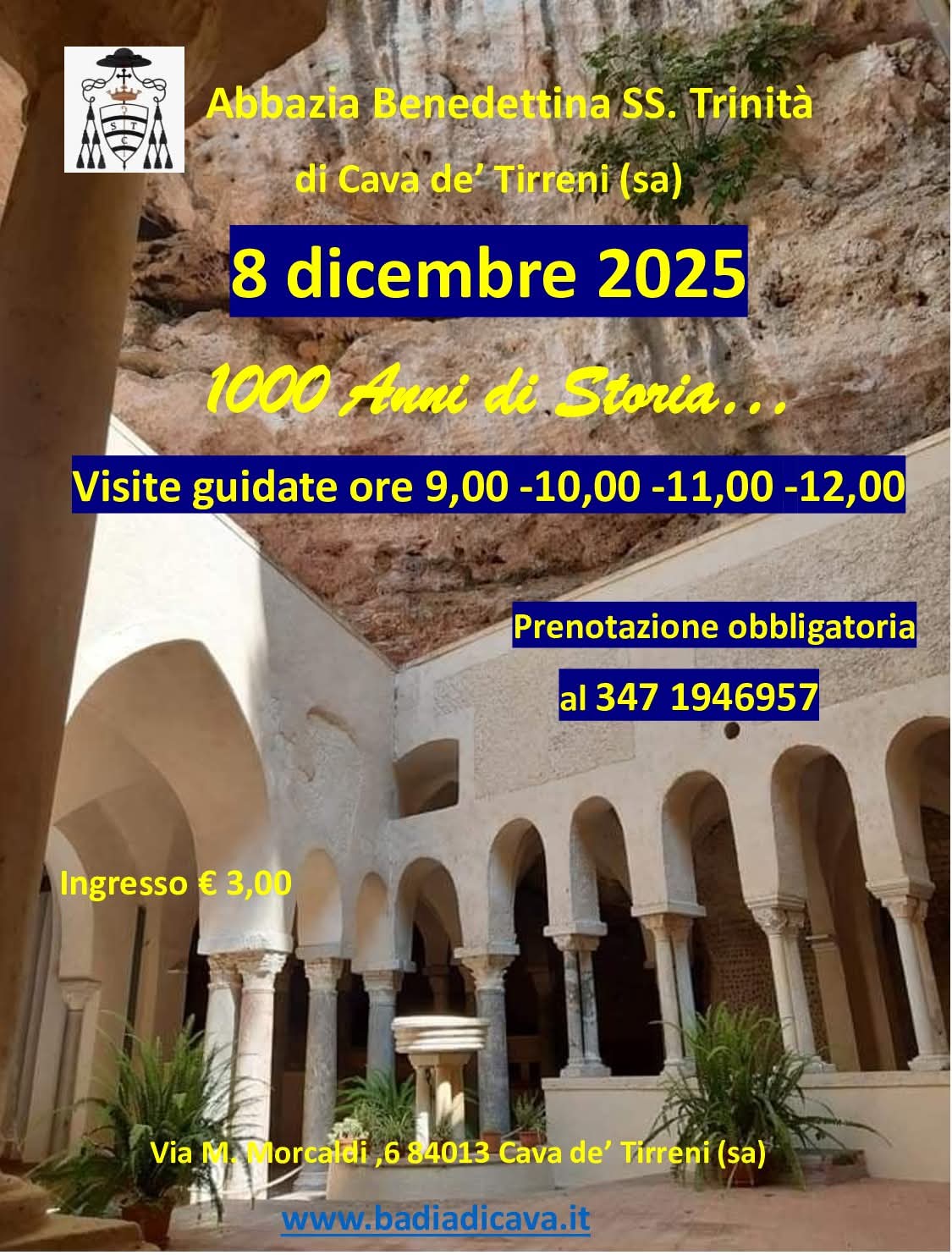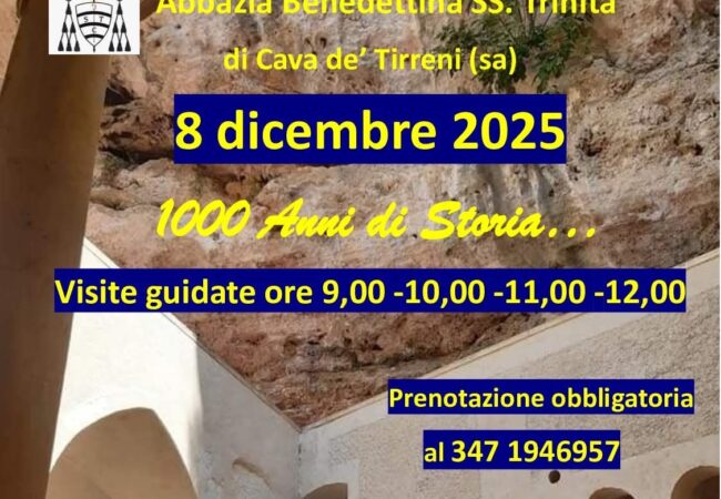 Il prossimo 8 dicembre, in occasione della solennità dell’Immacolata, l’Abbazia di Cava de’ Tirreni apre le sue porte con un programma di visite guidate per celebrare il millenario della sua fondazione. Un’occasione unica per riscoprire le radici spirituali, culturali e architettoniche di uno dei luoghi simbolo del Mezzogiorno