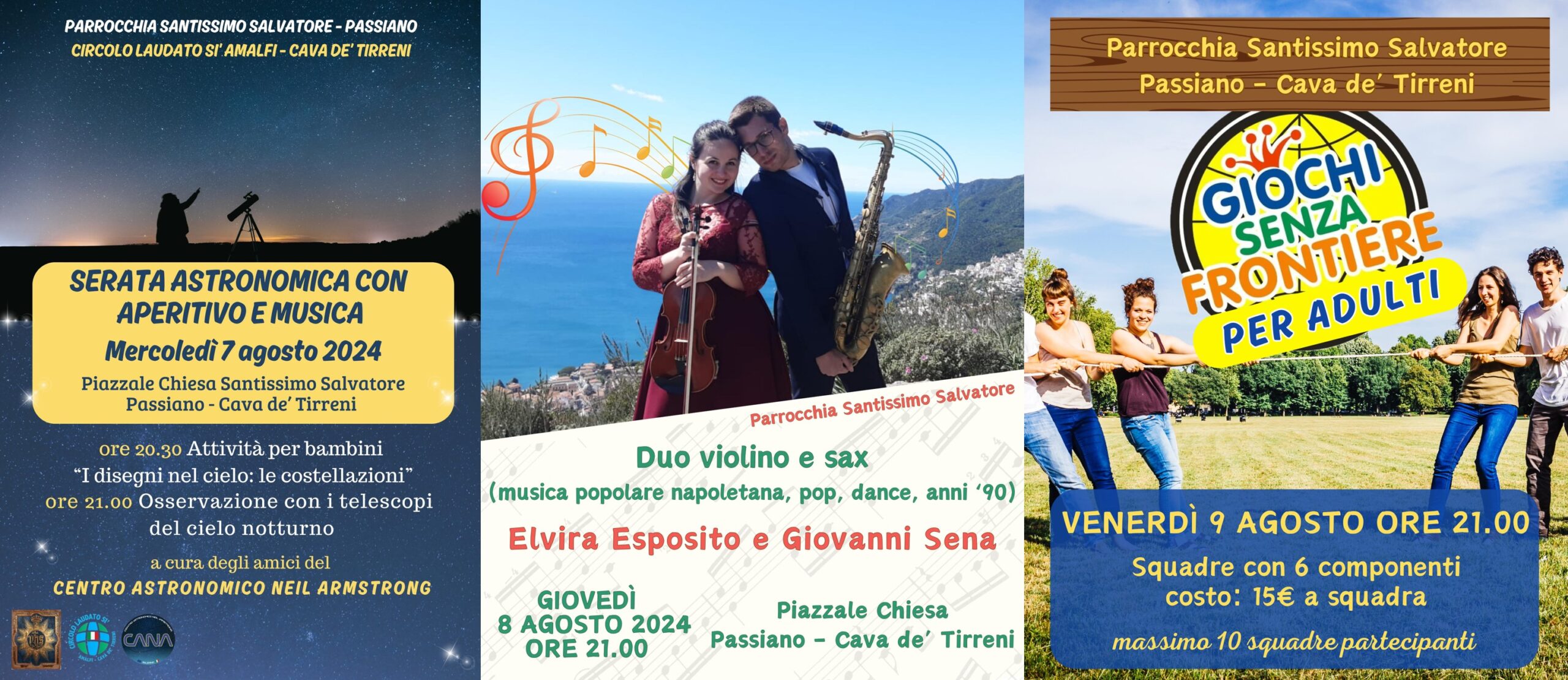 Gli ultimi tre eventi sono previsti il giorno 7 agosto, una serata astronomica con aperitivo e musica in collaborazione con il Circolo Laudato Si’ diocesano e il Centro Astronomico Neil Armstrong, giovedì 8 agosto, una serata animata con musiche popolari, degli anni ’90 e pop dal duo Elvira Esposito (violino) e Giovanni Sena (sassofono) e venerdì 9 agosto, serata di giochi per adulti.