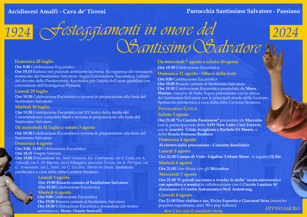 Nel clima festoso di questi giorni le Celebrazioni Eucaristiche avranno luogo alle ore 19:30, l’ultima delle quali domenica 11 agosto: il vescovo di Nola, Mons. Francesco Marino, presiederà la Santa Messa, dopo la quale seguirà la processione con la statua del SS. Salvatore per le principali strade della frazione.