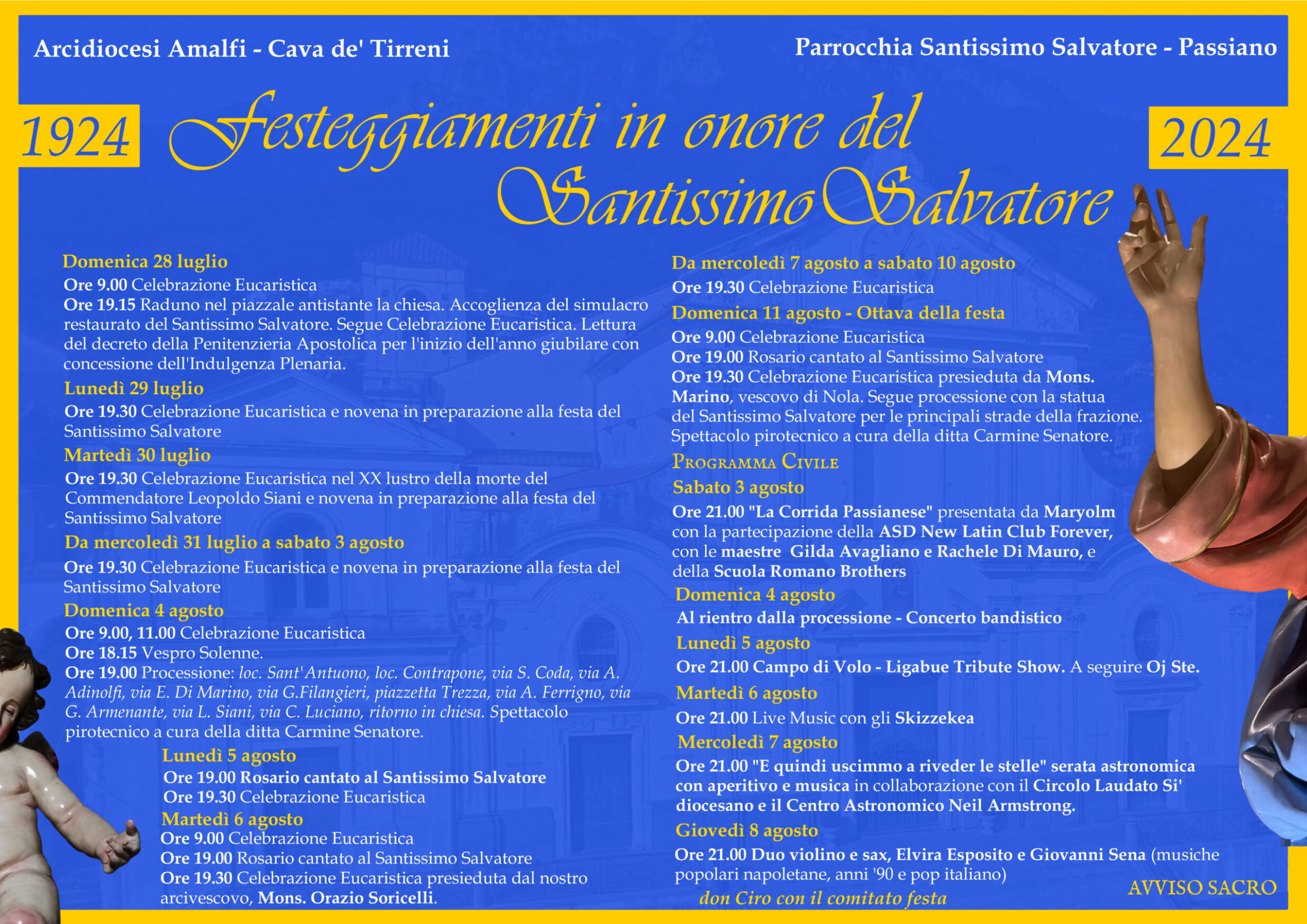 A tal proposito, la parrocchia del Santissimo Salvatore si accinge a celebrare la Trasfigurazione di N.S. Gesù Cristo i primi giorni di agosto. Conclusi i festeggiamenti dei santi patroni nelle altre parrocchie – come quelli in onore della Madonna del Carmelo o di Sant’Anna – la parrocchia di Passiano si appresta a vivere la propria festa patronale.