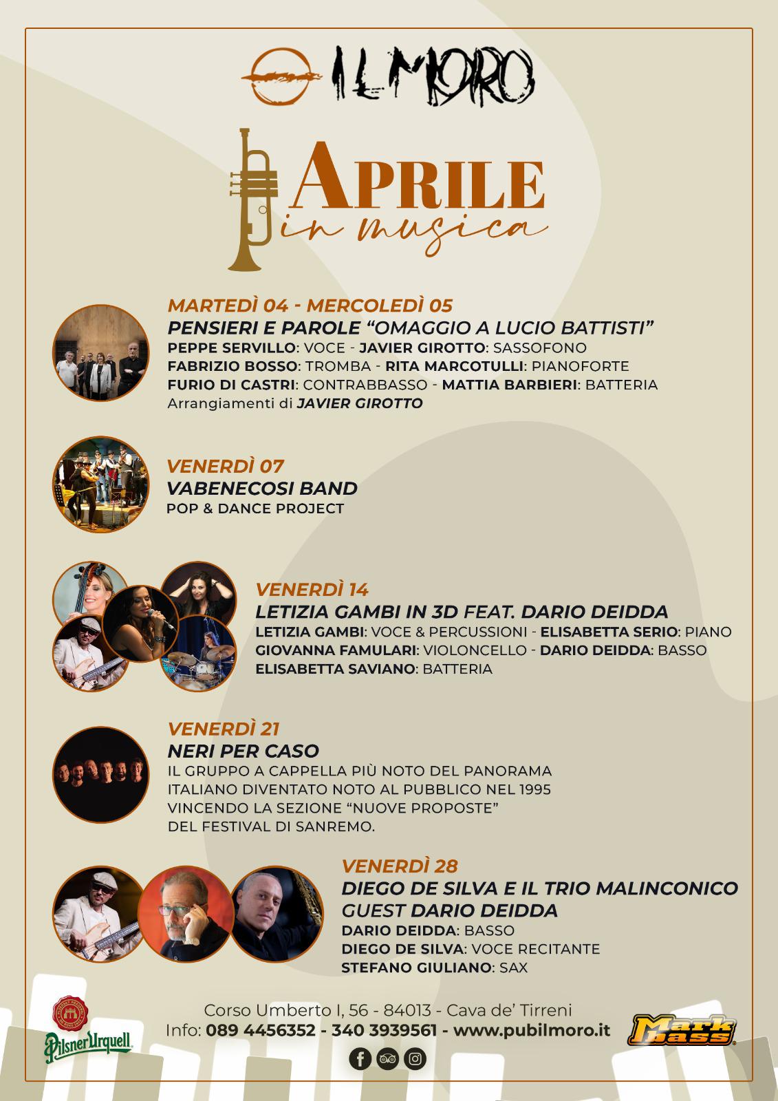 Continuano senza sosta gli appuntamenti con la musica live di successo presso il Ristopub “Il Moro” di Corso Umberto I°, 56. Il calendario del mese di aprile presenta eventi di assoluto richiamo per gli appassionati della buona musica e del buon cibo.
