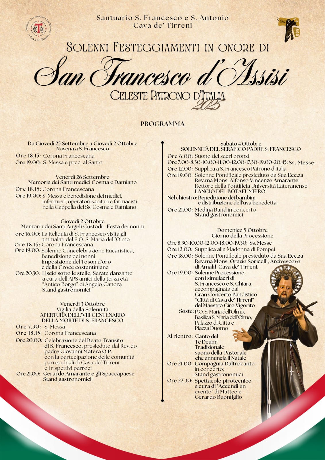 Cava de’ Tirreni, al via da giovedì prossimo il ricco programma civile e religioso dei festeggiamenti in onore di San Francesco patrono d’Italia