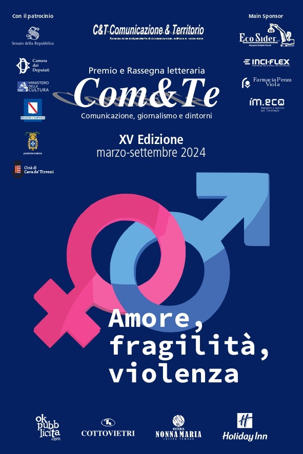 Al via il prossimo venerdì 8 marzo, Giornata internazionale della donna, alle ore 18, presso l’Holiday Inn di Cava de’ Tirreni, la XV edizione della rassegna letteraria Premio Com&Te, riservata alla saggistica e alla narrativa che richiamano la tragedia di un fenomeno devastante qual è il femminicidio sotto i più diversi profili, inerenti il tema prescelto, ovvero Amore, fragilità, violenza.