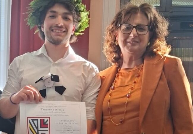 Lo studente, grazie ad una passione per il Sommo Poeta e alla guida sapiente della prof.ssa Maria Raffaella Forcellino, ha convinto la commissione con la declamazione dei versi del XIII Canto del Paradiso classificandosi al primo posto.