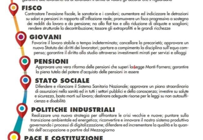 Le politiche del lavoro, l’equità fiscale, le politiche giovanili, l’equità delle pensioni rapportate al costo reale della vita, lo stato sociale e partire dal Servizio Sanitario Nazionale, le politiche industriali, la pace, e tutto ciò che l’attuale nostra Carta costituzionale garantisce saranno l’oggetto del prossimo raduno nella capitale, e l’avvio di un confronto a tutti i livelli.