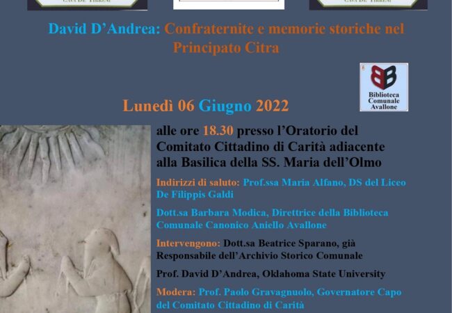 E’ prevista per il prossimo lunedì 6 giugno la presentazione del saggio del prof. David D’Andrea dell’Oklahoma State University dal titolo “Confraternite e memorie storiche nel Principato Citra”.
