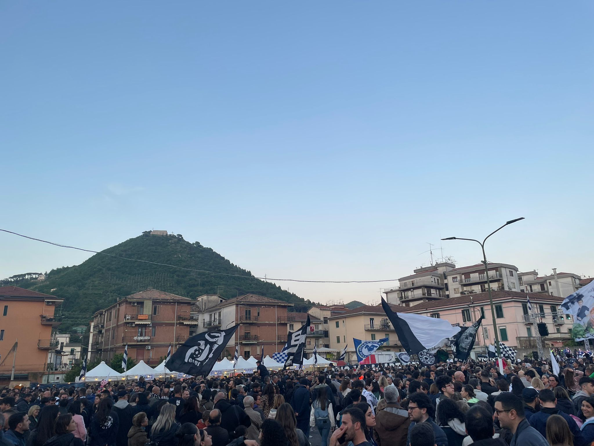 Entusiasmo incontenibile per i tifosi biancoblu al fischio finale, con il corteo guidato dalla Curva Sud partito dal Simonetta Lamberti fino a Piazza Lentini, dov’è poi andata in scena la festa promozione della squadra aquilotta. Boato all’arrivo dei giocatori, cori di affetto per la squadra e omaggio all’indimenticato Catello Mari, scomparso nel 2006 in seguito ad un incidente stradale di ritorno dalla festa promozione aquilotta.