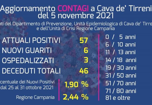 In aumento i positivi nella città di Cava de’ Tirreni. E’ quanto emerge dal bollettino di oggi, 5 novembre, dell’Unità Epidemiologica di Cava de’ Tirreni.