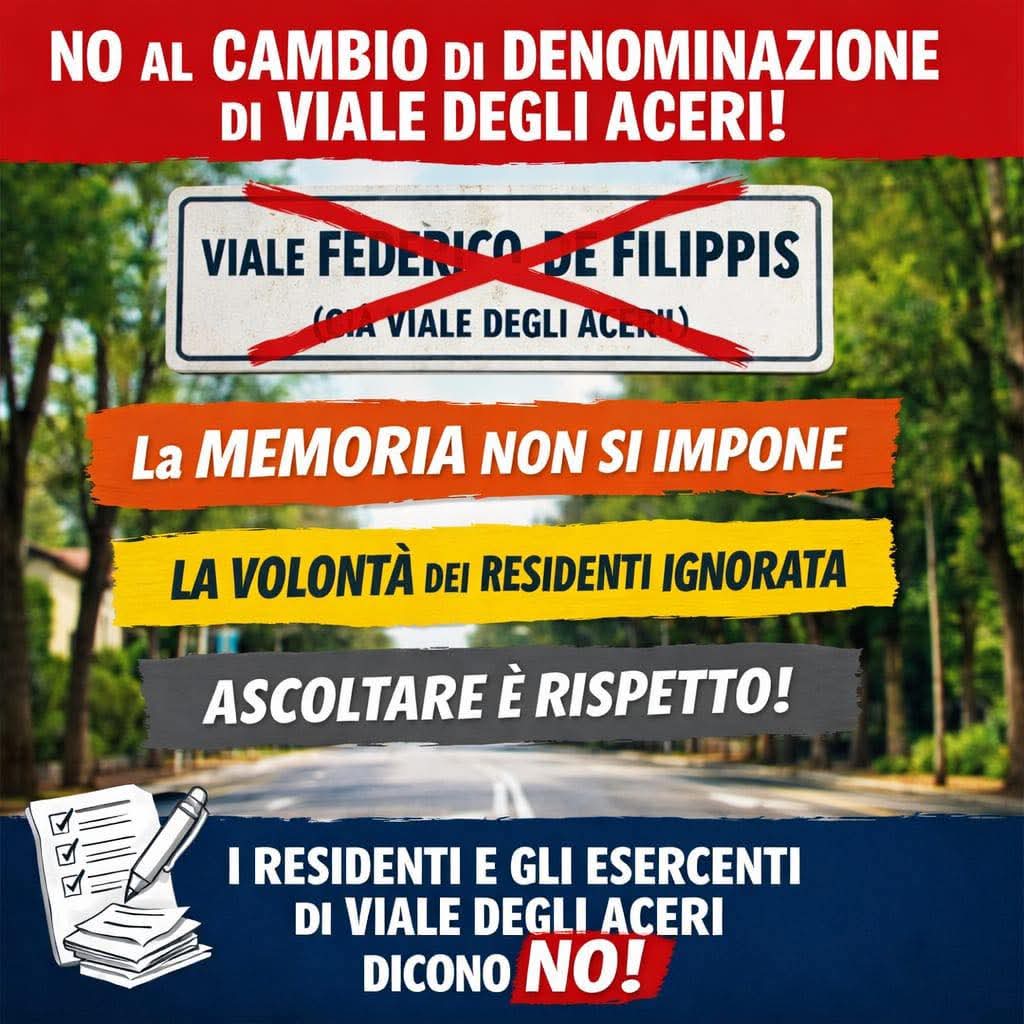 La decisione dell’amministrazione di rinominare Viale degli Aceri in onore di Federico De Filippis accende il dibattito sui social. Residenti, esercenti e movimenti civici denunciano una scelta “imposta” e chiedono di rispettare la toponomastica storica. Tensioni anche con alcuni familiari dell’ex sindaco