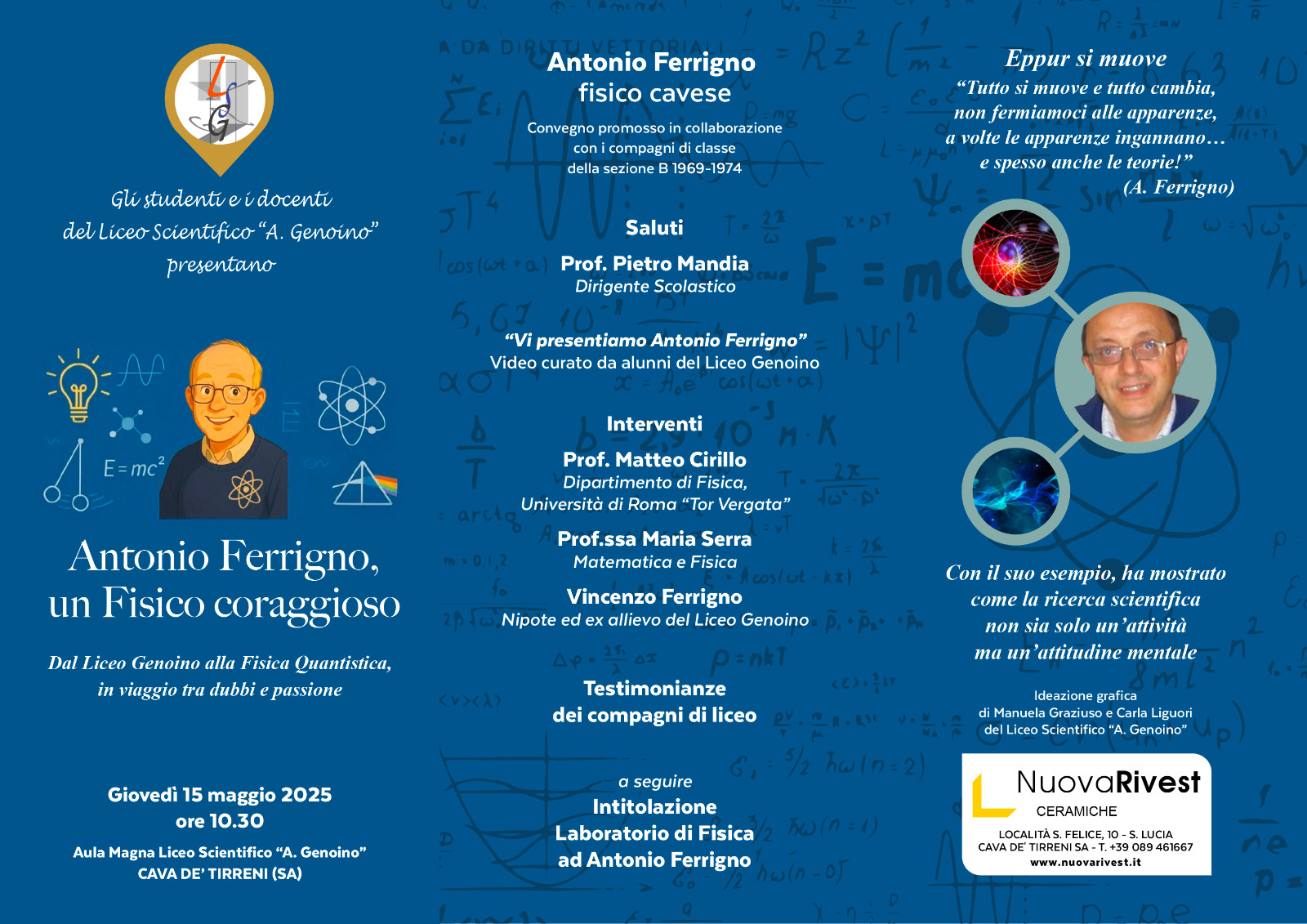 La manifestazione “Antonio Ferrigno, un fisico coraggioso: dal Liceo alla Fisica quantistica, in viaggio tra dubbi e passione” è stata promossa e co-organizzata dal Liceo Scientifico “Genoino” e dai compagni di classe della Sezione B 1969-1974.