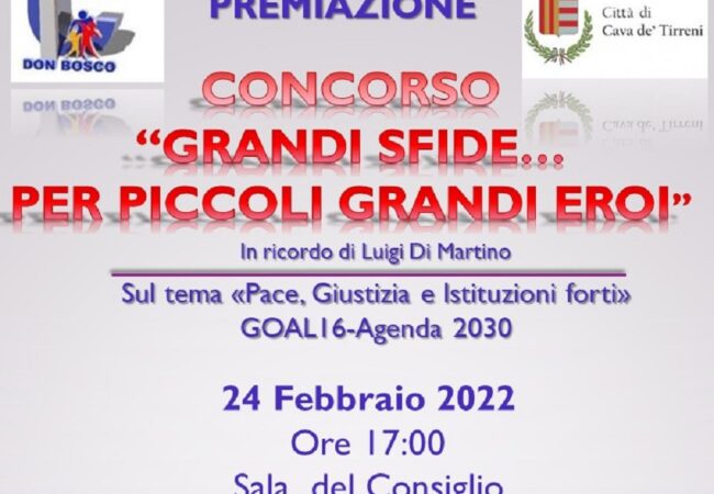 Domani, giovedì 24 febbraio, alle ore 17, presso l’Aula Consiliare di Palazzo di Città si terrà la premiazione del concorso “Grandi Sfide… per piccoli grandi eroi”, in ricordo del piccolo Luigi Di Martino, promosso dall’Istituto Comprensivo Don Bosco di Cava de’ Tirreni.