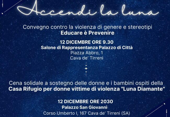 La sera del 12 dicembre, dalle ore 20.30, invece, presso il Palazzo S. Giovanni, all’interno del Complesso Monumentale di S. Giovanni di Cava de’ Tirreni, è in programma il Galà solidale “Accendi la luna”, con madrina d’onore della serata l’attrice Marina Suma e Saxophone show con Simon Sax e vocalist Morena Ascolese, in cui metà del ricavato della cena andrà al fondo “Luna Diamante”.