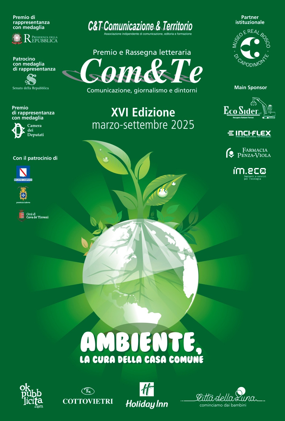 Al via il prossimo venerdì 28 marzo, alle ore 18, presso l’Holiday Inn di Cava de’ Tirreni, la XVI edizione della Rassegna letteraria Premio Com&Te, riservata alla saggistica e alla narrativa che richiamano l’ecologia e la sostenibilità sotto i più diversi profili, inerenti il tema prescelto, ovvero Ambiente, la cura della casa comune.