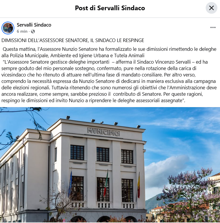 Si apre un nuovo capitolo nella vita politica cittadina: l’Assessore Nunzio Senatore ha annunciato le proprie dimissioni dalla Giunta Servalli, motivandole con “senso di responsabilità” e “rispetto verso la città”. Ma il Sindaco Vincenzo Servalli, con un comunicato ufficiale, ha deciso di respingerle.