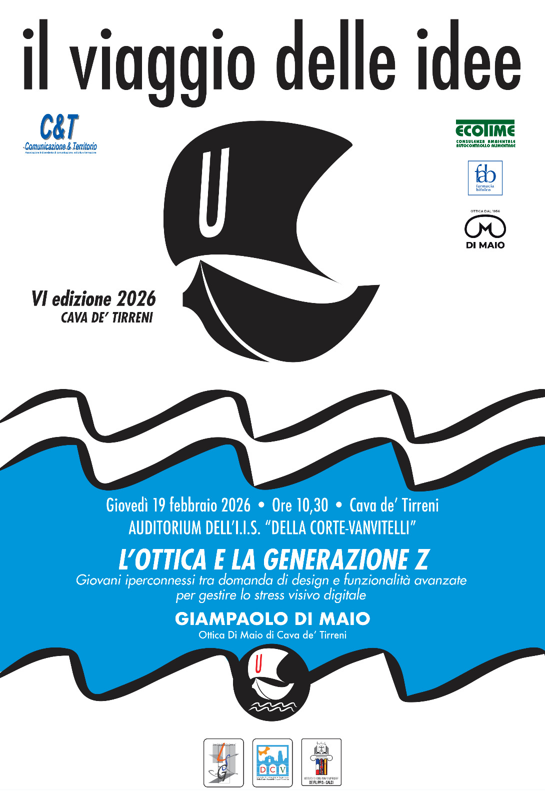 Il sesto e ultimo appuntamento della sesta edizione de Il Viaggio delle Idee si terrà il prossimo giovedì 19 febbraio, alle ore 10,30, presso l’Auditorium “Federico De Filippis” dell’I.I.S “Della Corte – Vanvitelli”, e vedrà come protagonisti Giampaolo e Angela Di Maio, dell’Ottica Di Maio di Cava de’ Tirreni, sul tema L’ottica e la generazione Z. Giovani iperconnessi tra domanda di design e funzionalità avanzate per gestire lo stress visivo digitale.