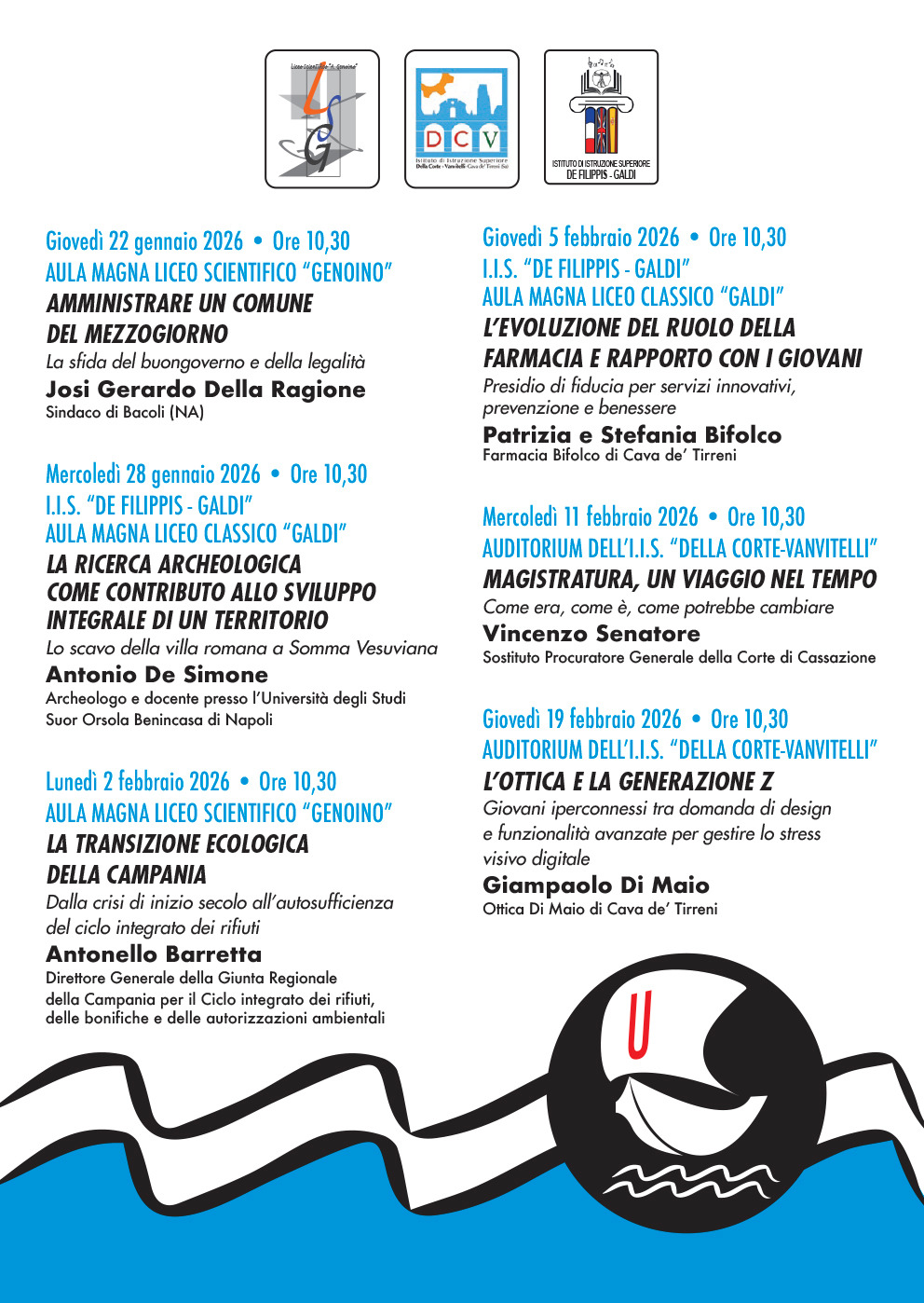 La sesta edizione si concluderà giovedì 19 febbraio, ancora presso l’Auditorium dell’I.I.S. “Della Corte–Vanvitelli”, con ospite Giampaolo Di Maio, dell’Ottica Di Maio di Cava de’ Tirreni, sul tema L’ottica e la generazione Z. Giovani iperconnessi tra domanda di design e funzionalità avanzate per gestire lo stress visivo digitale.