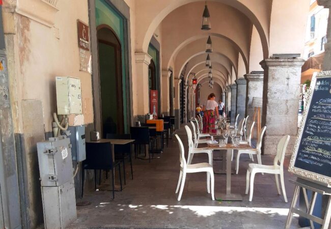 Cava de’ Tirreni, la vergogna dei tavolini che si “mangiano” il passaggio sotto i portici