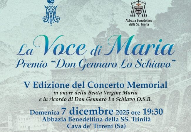La V Edizione del Memorial La Voce di Maria – Premio “Don Gennaro Lo Schiavo” si svolgerà domenica 7 dicembre alle ore 19:30 nella maestosa Abbazia Benedettina della Santissima Trinità di Cava de’ Tirreni. Per la prima volta l’evento, nato per ricordare Don Gennaro Lo Schiavo O.S.B. e celebrare la devozione mariana, trova spazio nel luogo che ha segnato la vita e la vocazione del sacerdote benedettino.