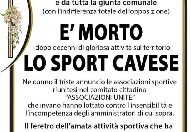 E’ quanto si legge in un manifesto funebre che sta circolando in rete. Una provocazione per raccontare quella che è, secondo le associazioni sportive cavesi, la morte dello sport amatoriale in seguito agli aumenti alle tariffe per l’uso delle palestre da parte delle associazioni.