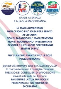 Tutti i gruppi consiliari di opposizione (La Fratellanza, Siamo Cavesi, Fratelli d’Italia, Forza Italia) hanno indetto una manifestazione di protesta che si terrà giovedì 30 settembre, in concomitanza col Consiglio comunale, sotto Palazzo di Città, a partire dalle ore 10 sino alle ore 20.