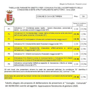 Semplicisticamente, in una trasmissione televisiva, Servalli, ha parlato del rendiconto 2020 e riferendosi allo stato deficitario del Comune, ha tentato di sminuire il significato e la portata degli indicidei parametri riportati nella apposita tabella, che per legge deve essere allegata al predetto rendiconto di gestione,di cui costituisce un allegato (art. 172, lett. e del T.U.E.L.), come prescrive l’art. 242 T.U.E.L..